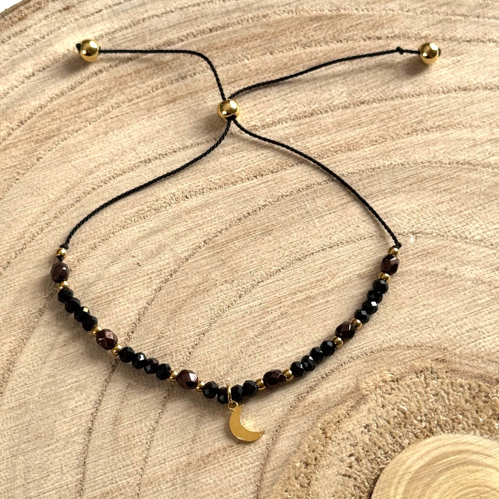 Bransoletka została uzupełniona o złote koraliki i symboliczną zawieszkę w kształcie księżyca, która dodaje jej wyjątkowego charakteru. Całość osadzona na regulowanym, wytrzymałym sznurku, dzięki czemu bransoletka dopasowuje się do każdego nadgarstka.